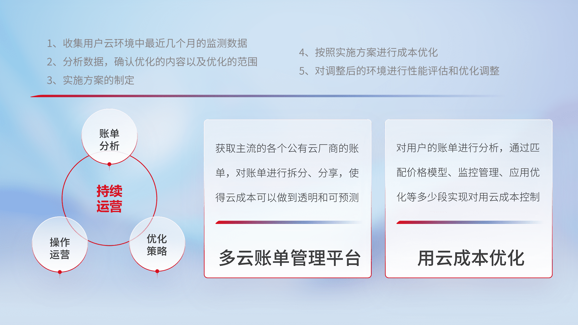 通过多云纳管,,,,以统一的资源数据模型把客户的云资源进行抽象和封装,,进而实现对多云资源的统一操作,,保障云资源管理的可靠性、、、稳定性与可用性。。。量身定制化运维内容,,配置、、开发运维、、、补丁管理、、、备份、、、、监控、、认证和访问管理、、审计和日常巡检等,,保障在用云过程中的可靠度,,,稳定度以及高可用率。。。