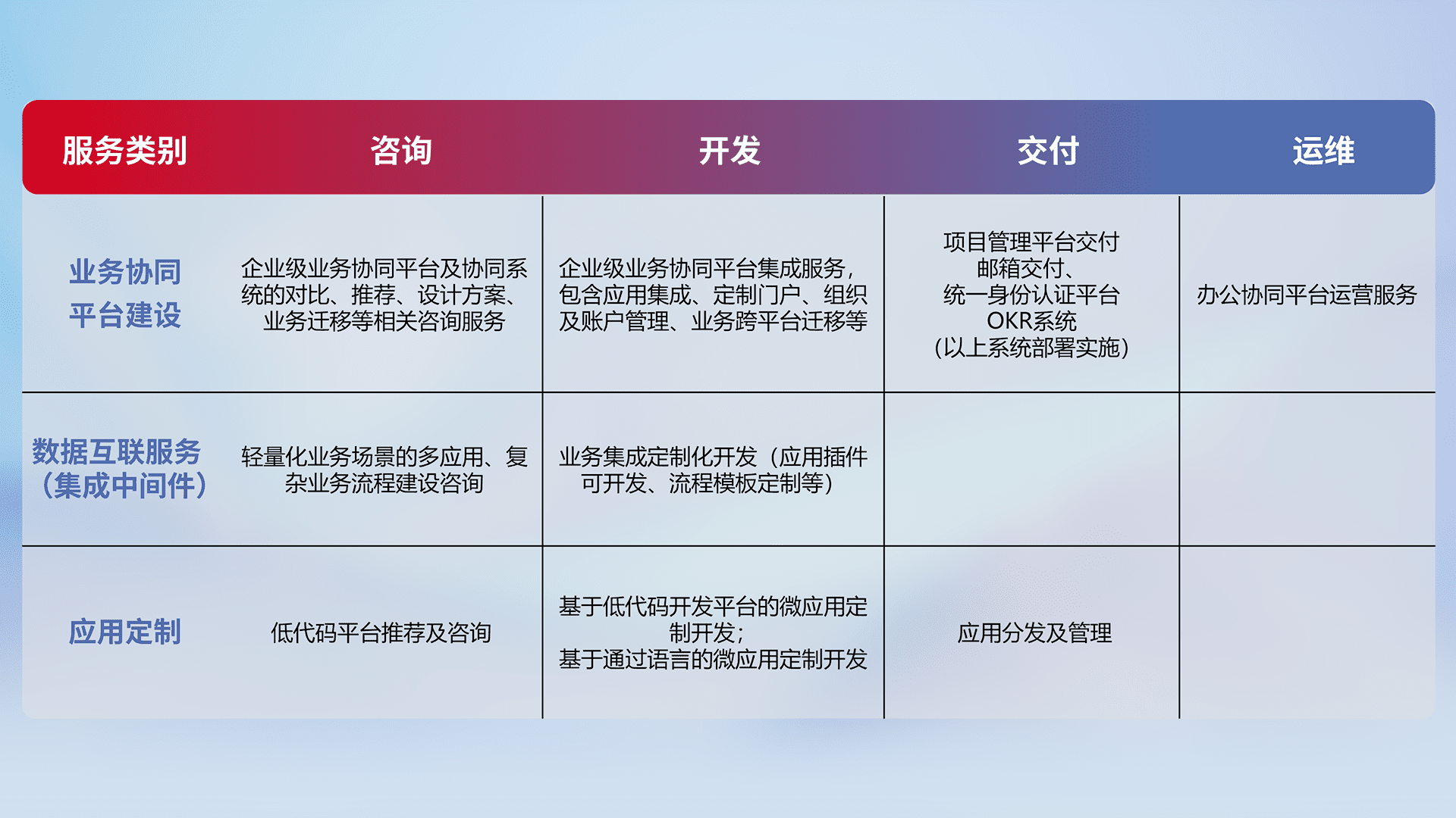 针对钉钉、、企微、、IDaas等平台级产品提供产品的规划、、方案、、、交付、、、、定制化开发等服务,,,实现如统一协同办公、、、、智能客户服务、、、、混合会议管理、、、、智能数据查询、、等业务场景,,,实现数字化转型。。。。